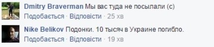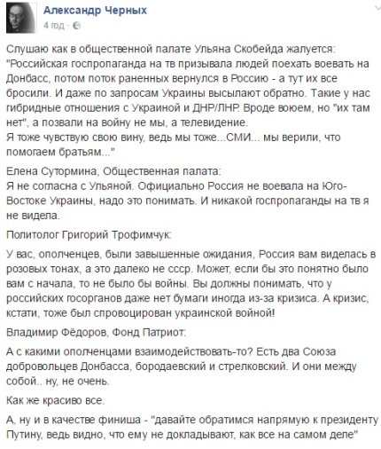 "Слушаю как в общественной палате Ульяна Скобейда (российская журналистка - ред.) жалуется: "Российская госпропаганда на тв призывала людей поехать воевать на Донбасс, потом поток раненных вернулся в Россию - а тут их все бросили. И даже по запросам Украины высылают обратно. Такие у нас гибридные отношения с Украиной и ДНР/ЛНР. Вроде воюем, но "их там нет", а позвали на войну не мы, а телевидение. Я тоже чувствую свою вину, ведь мы тоже...СМИ... мы верили, что помогаем братьям...", - написал Черных на своей странице в Facebook.