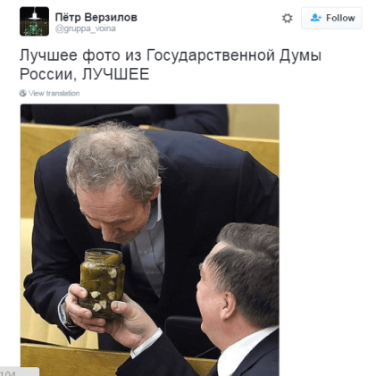 В сети смеются над фотографией депутатов Государственной Думы Российской Федерации, которые любуются банкой консервированных огурцов.