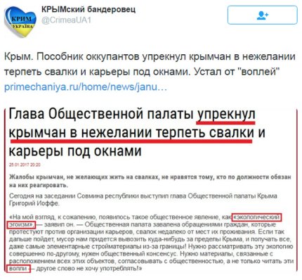 «Крым. Пособник оккупантов упрекнул крымчан в нежелании терпеть свалки и карьеры под окнами. Устал от «воплей», - прокомментировал блогер и опубликовал соответствующий скриншот со страницы СМИ оккупантов.