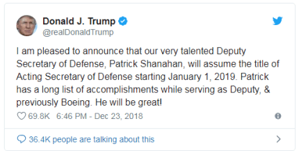 "Рад объявить, что талантливый первый заместитель министра обороны Патрик Шанахан станет исполняющим обязанности главы Пентагона с 1 января 2019 года. Патрик имеет большой список достижений, он много чего достиг за время работы заместителем, а до этого - в компании Boeing", - написал президент США.