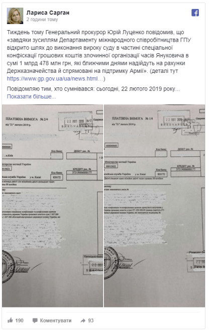 Пресс-секретарь главы ГПУ Лариса Сарган сообщила, что на счет Госказначейства Украины перечислили 1,5 миллиарда гривен окружения бывшего президента Виктора Януковича, передает ONLINE.UA со ссылкой на Facebook пресс-секретаря прокуратуры.