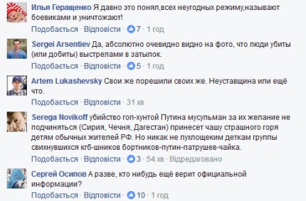 "А сегодня все стало понятно, как я и подозревал: "Новая" публикует фотографии убитых боевиков (по ссылке они, что называется, 18+). Прямые выстрелы в голову, никак не похожие на "боестолкновение", "муляжи поясов" прикручены липкой лентой поверх одежды так, что понятно – прикручивали их уже после", - добавил он.
