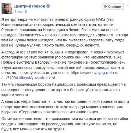 "Я не зря вчера не мог понять очень странную фразу НАКа (это Национальный антитеррористический комитет): мол, на телах боевиков, напавших на Нацгвардию в Чечне, были муляжи поясов шахидов. Согласитесь – или вы пытаетесь завладеть оружием, и тогда вам не нужны пояса шахидов, или вы пытаетесь взорвать базу, тогда вам не нужны муляжи. Что-то было, очевидно, нечисто", - написал на своей странице в Facebook экс-депутат Госдумы, ныне оппозиционный политик Дмитрий Гудков.