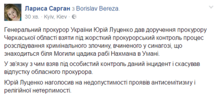 "Генеральный прокурор Украины Юрий Луценко дал поручение прокурору Черкасской области взять под жесткий прокурорский контроль процесс расследования уголовного преступления, совершенного в синагоге, что находится возле Могила цадика раби Нахмана в Умани", - написала Сарган.
