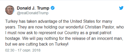 "Турция много лет использовала США. Теперь они удерживают нашего замечательного христианского пастора, который представляет нашу страну как большой заложник-патриот. Мы ничего не заплатим за освобождение невиновного человека, но мы сократим расходы на Турцию" - заявил Трамп.