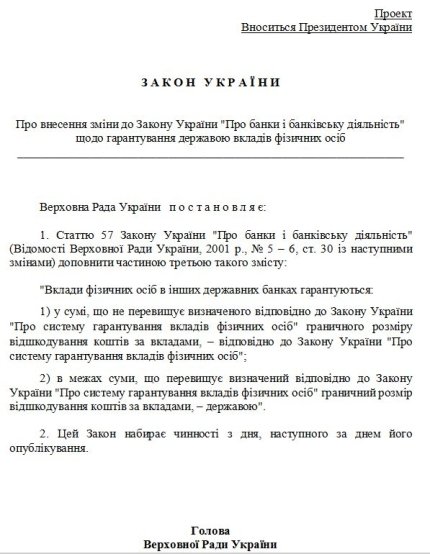 Документ о внесении изменений в закон "О банках и банковской деятельности" по поводу гарантирования государством вкладов физических лиц зарегистрирован 19 декабря под номером 5553.