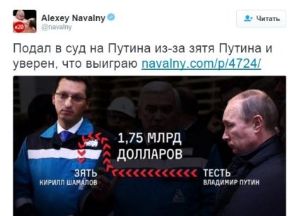 Основатель Фонда борьбы с коррупцией и российский оппозиционер Алексей Навальный подал административный иск в Тверской суд против президента Российской Федерации Владимира Путина, передает ONLINE.UA со ссылкой на сайт Навального.