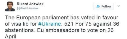 "Европейский парламент проголосовал за визовую либерализацию для Украины. За проголосовали, 521, против – 75, воздержались – 36. Послы ЕС будут голосовать 26 апреля", – написал он.