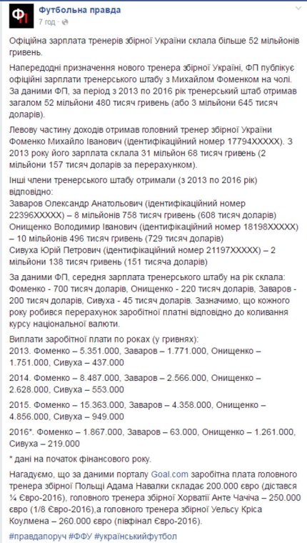 Бывший главный тренер сборной Украины Михаил Фоменко за 4 года тренерской работы с главной командой страны заработал 31 млн 68 тысяч гривен.