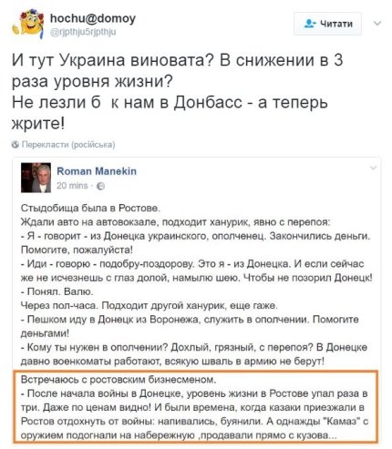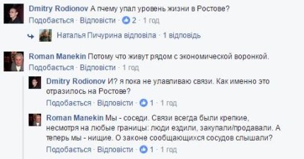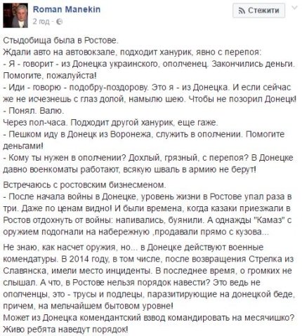 "После начала войны в Донецке, уровень жизни в Ростове упал раза в три. Даже по ценам видно! И были времена, когда казаки приезжали в Ростов отдохнуть от войны: напивались, буянили. А однажды "Камаз" с оружием подогнали на набережную ,продавали прямо с кузова...", - процитировал в числе прочего Манекин слова ростовского бизнесмена.
