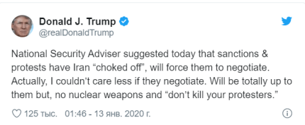 "Советник по национальной безопасности сегодня заявил, что санкции и протесты заставят Иран вести переговоры. На самом деле, меня совершенно не волнует, пойдут ли они на переговоры. Это будет полностью зависеть от них, но никакого ядерного оружия и не убивайте своих протестующих", - говорится в обращении Трампа.