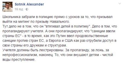 Российский журналист Александр Сотник: "Учителя должны быть люстрированы. За пропаганду, за ложь, за непрофессионализм, наконец. То, что они внушают детям - чистой воды преступление".