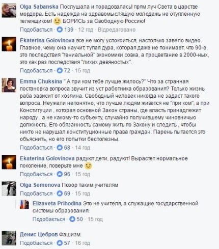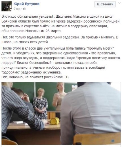 Украинский журналист Юрий Бутусов: "Нет, это только вдуматься! Школьник задержан. За призыв к митингу. В школе, на глазах всех детей. Диалог бесподобный - школьники показали себя принципиально, а учителя наоборот хотели вызвать всеобщий "одобрямс" задержанию их ученика. Это, конечно, не покажет российское ТВ".