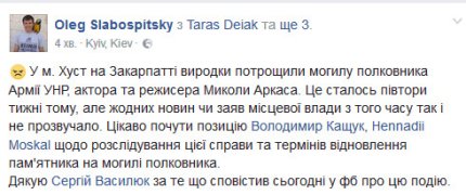 "Изуродована могила.. Николая Аркаса. В Украине, на Закарпатье", - написал он и опубликовал несколько фото с места инцидента.