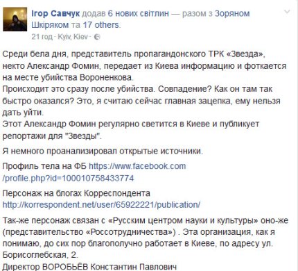 "Среди бела дня, представитель пропагандонского ТРК "Звезда", некто Александр Фомин, передает из Киева информацию и фоткается на месте убийства Вороненкова. Происходит это сразу после убийства. Совпадение? Как он там так быстро оказался? Это, я считаю сейчас главная зацепка, ему нельзя дать уйти", - написал Савчук.