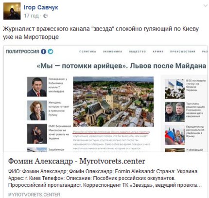 "Этот Александр Фомин регулярно светится в Киеве и публикует репортажи для "Звезды". Также персонаж связан с "Русским центром науки и культуры" оно же (представительство "Россотрудничества") . Эта организация, как я понимаю, до сих пор благополучно работает в Киеве, по адресу ул. Борисоглебская, 2", - сообщил волонтер.