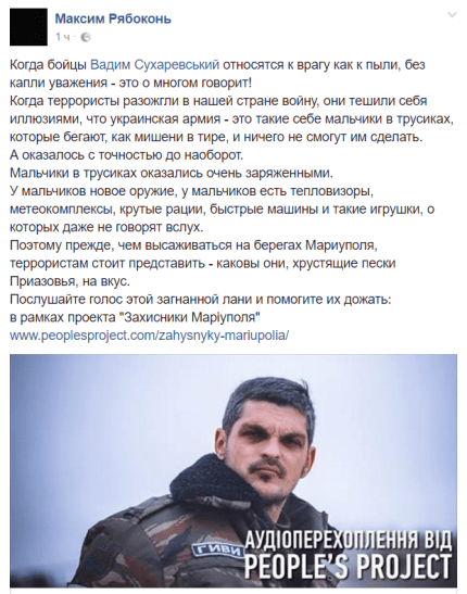 "Сегодня мы получили уникальную аудиозапись. Его передали нам наши друзья из-под Мариуполя: этот перехват телефонного разговора террориста из отряда "Гиви", который в настоящее время безуспешно пытается прорвать рубежи обороны морской пехоты", - сообщили в волонтерском центре.