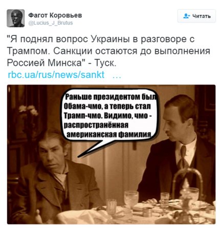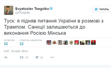 «Туск: я поднял вопрос Украины в разговоре с Трампом. Санкции остаются до выполнения Россией Минска», - написал Цеголко.
