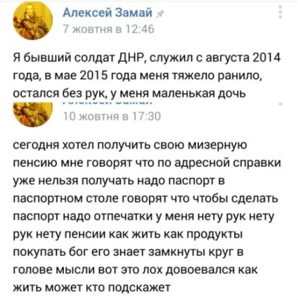 "Сегодня хотел получить свою мизерную пенсию. Мне говорят, что по адресной справке уже нельзя получать, надо паспорт в паспортном столе. Говорят, чтобы сделать паспорт, надо отпечатки. У меня нет рук. Нет рук - нет пенсии. Как жить? Как продукты покупать? Бог его знает. Замкнутый круг в голове. Мысли: вот это лох довоевался, как жить может, кто подскажет", - написал мужчина.