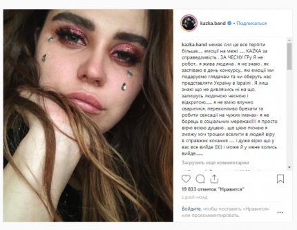 "Нет сил это все терпеть больше. Эмоции на грани... KAZKA за справедливость, за честную игру. Я не робот, я живой человек. Я не знаю, как спою в день конкурса, какие эмоции мы подарим зрителям, выберут нас представлять Украину в Израиле. Я только знаю, что несмотря ни на что, останусь человеком честным и открытым. Я не умею ссориться, убедительно врать и делать сенсации на чужих именах — я не борец в социальных сетях! Я просто верю всей душой, что этой песней я смогу хоть немного вселить в людей веру в любовь. И очень верю, что у вас все получится). А может и у меня когда-нибудь тоже", — написала певица.