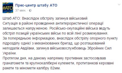 "По предварительной информации, в результате обстрела опорного пункта подразделения одной из механизированных бригад, расположенного недалеко от Авдеевки, погиб военнослужащий Вооруженных Сил Украины", – говорится в сообщении.