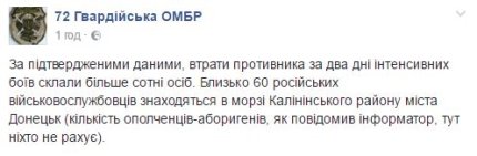 Согласно данным 72-ой гвардейской отдельной механизированной бригады, за два дня с момента обострения конфликта в районе авдеевской промзоны погибло более сотни противников.