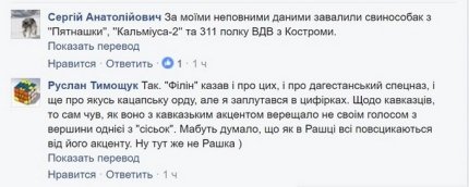 Руслан Тимощук добавил: "Да. "Филин" говорит и про этих, и про дагестанский спецназ, и еще про какую-то кацапскую орду, но я запутался в цифрах. Касательно кавказцев, то сам слышал, как оно с кавказским акцентом визжало не своим голосом".