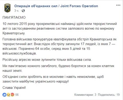 В посте отмечается, что вооруженная атака в Краматорске в 2015 году в Главной военной прокуратуре Украины квалифицирована как террористический акт. Тогда при обстрелах погибли 17 человек, а еще 64 человека получили ранения. Среди них 5 детей и 15 военнослужащих.