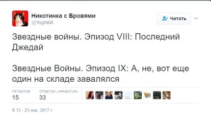 Компания Disney объявила о том, что 8 эпизод известной саги "Звёздные войны" будет называться "Звёздные войны: Последний джедай" (Star Wars: The Last Jedi).