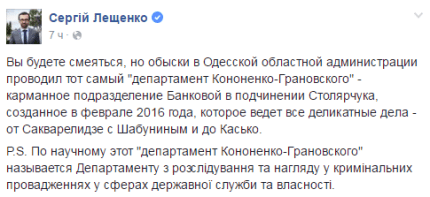 Народный депутат от БПП Сергей Лещенко в Facebook написал, что обыски проводит "департамент Кононенко-Грановского" – карманное подразделение Банковой в подчинении Столярчука, созданное в феврале 2016 года, которое ведет все деликатные дела - от Сакварелидзе с Шабуниным и до Касько".