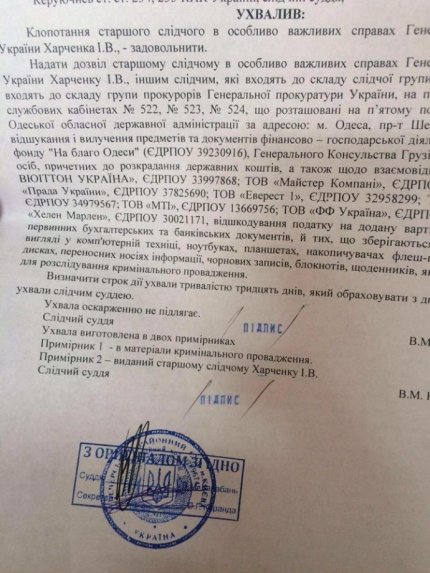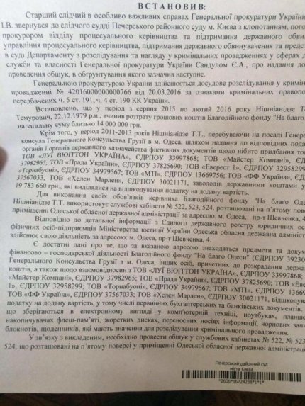 Печерский районный суд Киева дал разрешение следователям на обыски в кабинете помощника главы Одесской ОГА Михеила Саакашвили и экс-генконсула Грузии Теймураза Нишнианидзе, а также по месту регистрации фонда "На благо Одессы".