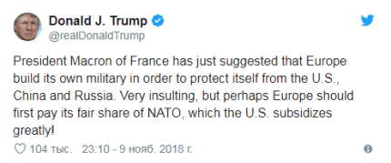В соцсети Трамп написал, что идея Макрона хоть и оскорбительна, но возможна для реализации. Но он призвал Европу вплатить свою долю в финансировании НАТО, так как в настоящее время натовскую армию в значительной степени субсидируют только США.