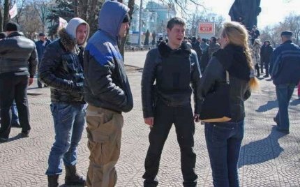 По словам Филиппова, однажды его товарищ рассказал об общем знакомом, у которого в момент появились деньги, травматическое оружие: "У Димона появились деньги, он ходит, гульбасит — в бронежилете и с пистолетом. Людей собирает, их организация называется "Луганская самооборона". Я говорю: "В смысле — с каким пистолетом, он же два раза на "зоне" был?" Я знал этого Диму, и знал что он не очень-то порядочный человек. Вот он, на фото — в центре, в "бронике".