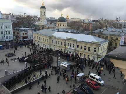«Выхожу с самокатом из дома в 14.50, чтобы к 15.00 доехать на нём к Балчуг-Кемпински. На самокате не проехать по Пятницкой – колорады и крымнашисты идут плотной толпой в том же направлении. С трудом продираюсь к перекрёстку Садовнической наб. и ул. Балчуг, там тоже всё перекрыто. По всей протяжённости Пятницкой ул. стоят военные машины и автозаки, в которых греются ОМОНовцы», — добавил он.