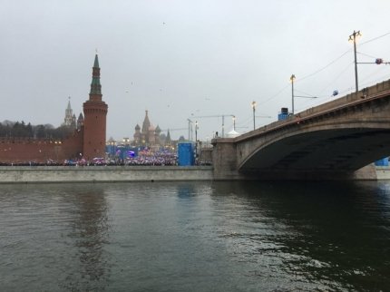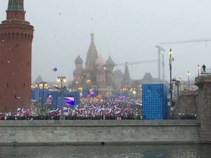 «Нахожусь там полтора часа, выхожу в 16.30. Проезжаю под Большим Москворецким мостом в том месте, где Раушская набережная переходит в Софийскую набережную, всё перекрыто во все стороны. Начинает идти снег. Смотрю с Софийской набережной на другую сторону Москвы-реки, на Кремлёвскую набережную – она вся перекрыта, заполнена колоннами крымнашистов и колорадов. Большой Москворецкий мост, прямо на том месте, где убили Бориса Немцова – заполнен крымнашистами и колорадами. Вижу прямо по курсу Васильевский спуск – заполнен крымнашистами и колорадами. Из мегафонов и репродукторов аж на моём берегу реки раздаётся скрежещущий женский голос: «...и я хочу сказать, что я тоже – молодая мама! И я, и такие как я, не хотим, чтобы женщины, матери, проливали свои слёзы в Крыму! Закончились их слёзы, теперь они с нами! Крым наш!!!», — поделился он.