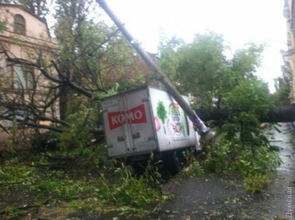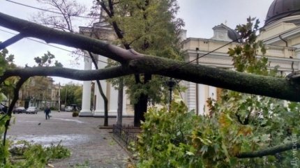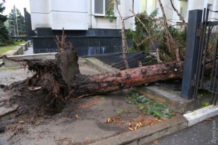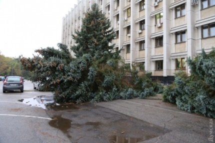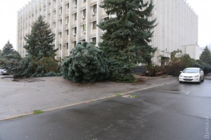 Так, возле здания Одесской областной администрации упало три больших ели. Эти деревья находились справа от центрального входа. Деревья не были скреплены тросами. Остальные ели стянуты растяжками к бетонным блокам.