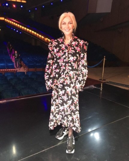 "Перед началом шоу. Скоро на грим", - подписала снимок певица, на котором стоит на сцене в длинном цветочном платье и кроссовках.