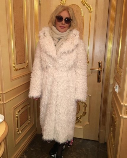 Певица позирует на фото в белой шубе и солнцезащитных очках.
