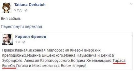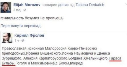 "Православная, исконная "Малороссия" Киево-Печерских преподобных, Иоанна Вишенского, Ионна Наумовича и Дениса Зубрицкого, Алексия Карпаторусского, Богдана Хмельницкого, Тараса Бульбы, Гоголя и Максимовича, с Богом, вперед!", - написал Фролов.