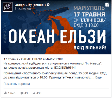 «17 мая "Океан Эльзи" отыграют концерт в Мариуполе. В программу концерта войдут как известные песни ОЕ, так и, впервые, состоится публичная концертная презентация нескольких композиций из нового альбома, который выйдет в ближайшее время», - сказано в сообщении.