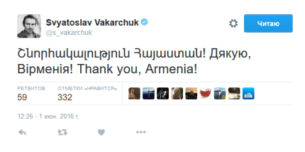 После концерта Святослав на своей странице в Twitter поблагодарил ереванских фанов, написав на армянском, украинском и английском языках: