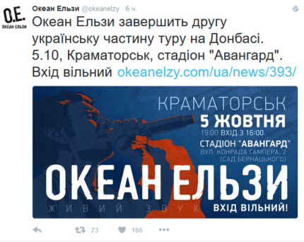Украинская рок-группа "Океан Эльзы" даст бесплатный концерт в Краматорске, который закроет вторую украинскую часть "Мирового тура 2016-2017" коллектива.