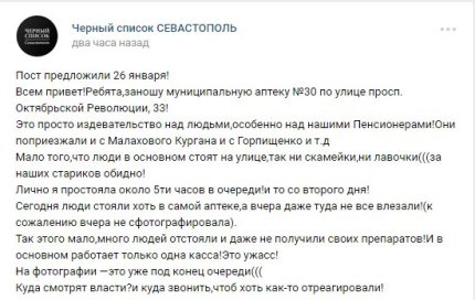 Отмечается, что теперь севастопольцы вынуждены по несколько часов стоять в огромных очередях за лекарствами.