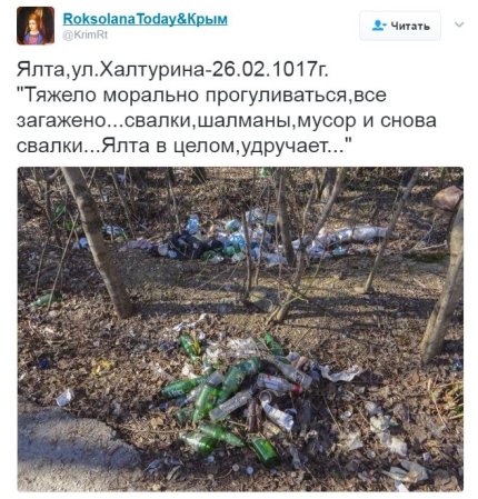 "Ялта, ул. Халтурина - 26.02.1017 г. "Тяжело морально прогуливаться, все загажено... свалки, шалманы, мусор и снова свалки... Ялта в целом, удручает...", - добавила RoksolanaToday&Крым.