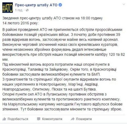 Также публиковалась краткая сводка событий суток 13 февраля с актуальной картой АТО и перечнем провокаций боевиков России потерь с обеих сторон.