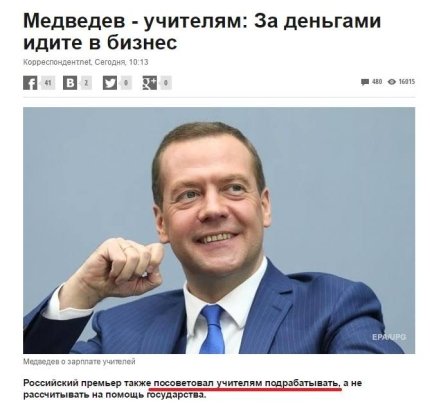Премьер-министра России Дмитрия Медведева, который заявил, что преподавание является призванием, и недовольные маленькими зарплатами в сфере образования могли выбрать другую профессию, высмеяли в сети интересным фото.