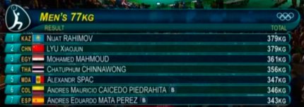 2:47. олимпийским чемпионом в тяжелой атлетике в весовой категории до 77 кг стал казах Ниджат Рахимов. "Серебро" - у китайца Ксяохуна Лю. А "бронзу" взял египтянин Мохамед Махмуд