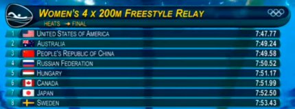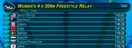 6:08. олимпийское "золото" в эстафете 4х200 метров вольным стилем завоевали американки. "Серебро" - у австралиец, "бронза" - у Канады