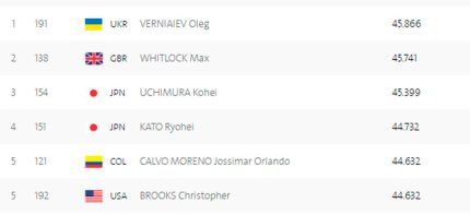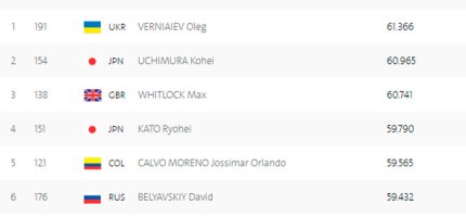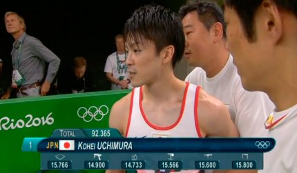 0:00. первый из японцев - Риохей Като - получил за брусья 14.900 баллов и теперь отстает от Олега на почти на 3 балла. Остался еще Кохей Учимура
