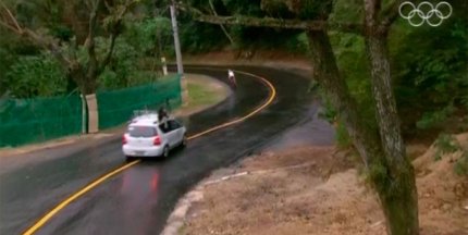14:44. в Рио сегодня пасмурно и в многих районах города идет дождь. В частности, дождь сопровождает и велосипедисток